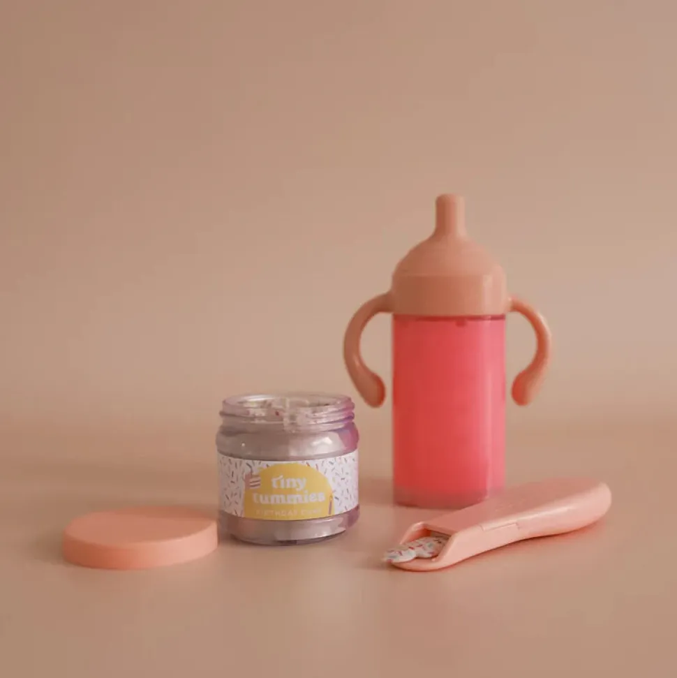 Celebra una fantástica fiesta de cumpleaños con tu muñeca. Hoy tenemos un biberón de batido de fresa y un potito con sabor a tarta.