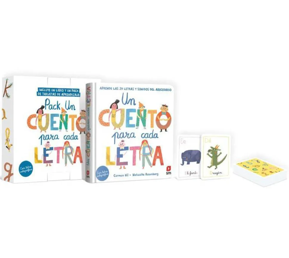 Este pack contiene un libro recopilatorio de 29 cuentos, uno por cada letra del abecedario, ideado para que los niños que están aprendiendo a leer y escribir distingan las grafías y sonidos de cada letra y aprendan a reconocerlas. Y además, 29 tarjetas educativas de cada letra con una propuesta de juegos y actividades que ayuden al niño en el proceso de aprendizaje del abecedario.