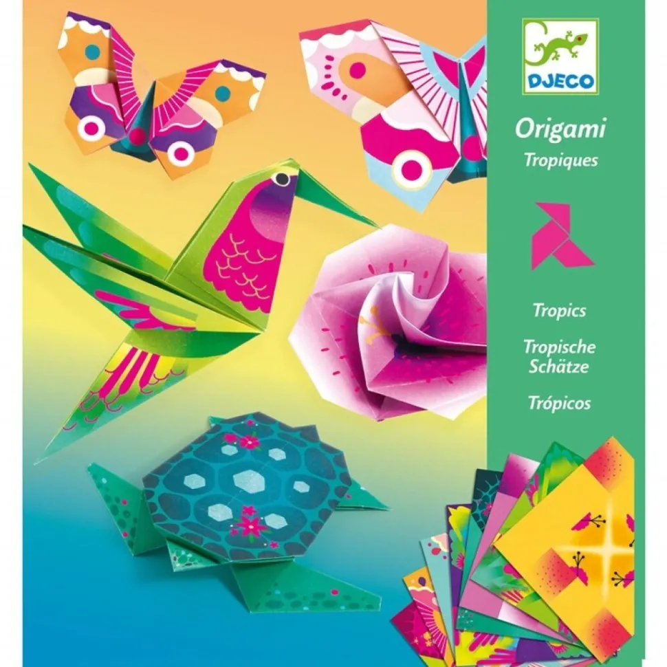 Rumbo al sol del Trópico con este estuche de origami de aires exóticos. Flores, colibrís, tortugas y mariposas realzadas en rosa fluorescente. Siguiendo las explicaciones del cuadernillo y las marcas trazadas, el niño pliega el papel hasta realizar 24 maravillas de papel.