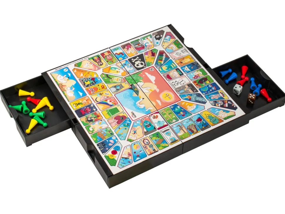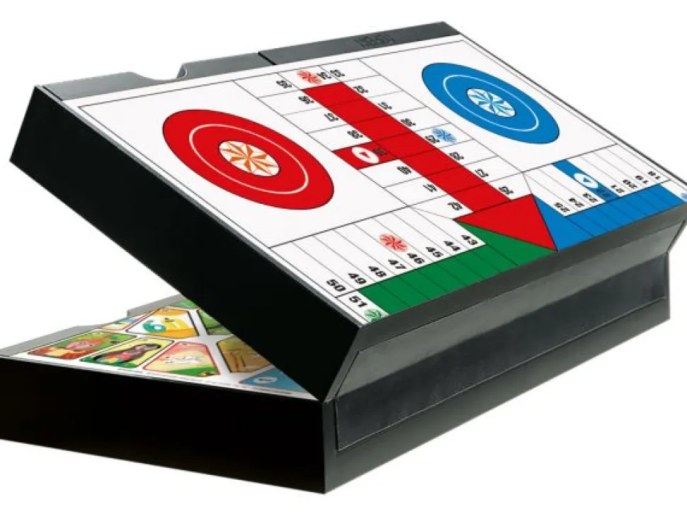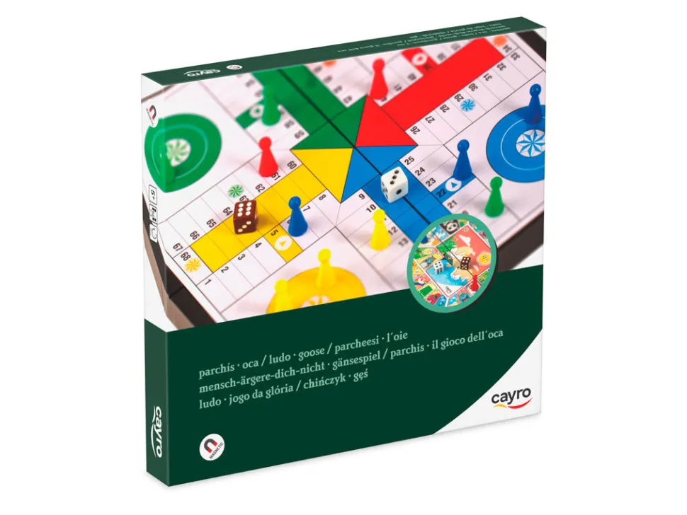 Con esta compacta caja podrás jugar a 2 juegos diferentes, parchís y oca. Las fichas (magnéticas) están alojadas en los cajones y dependiendo en la posición que coloques el tablero de juego, podrás o no abrir el cajón.