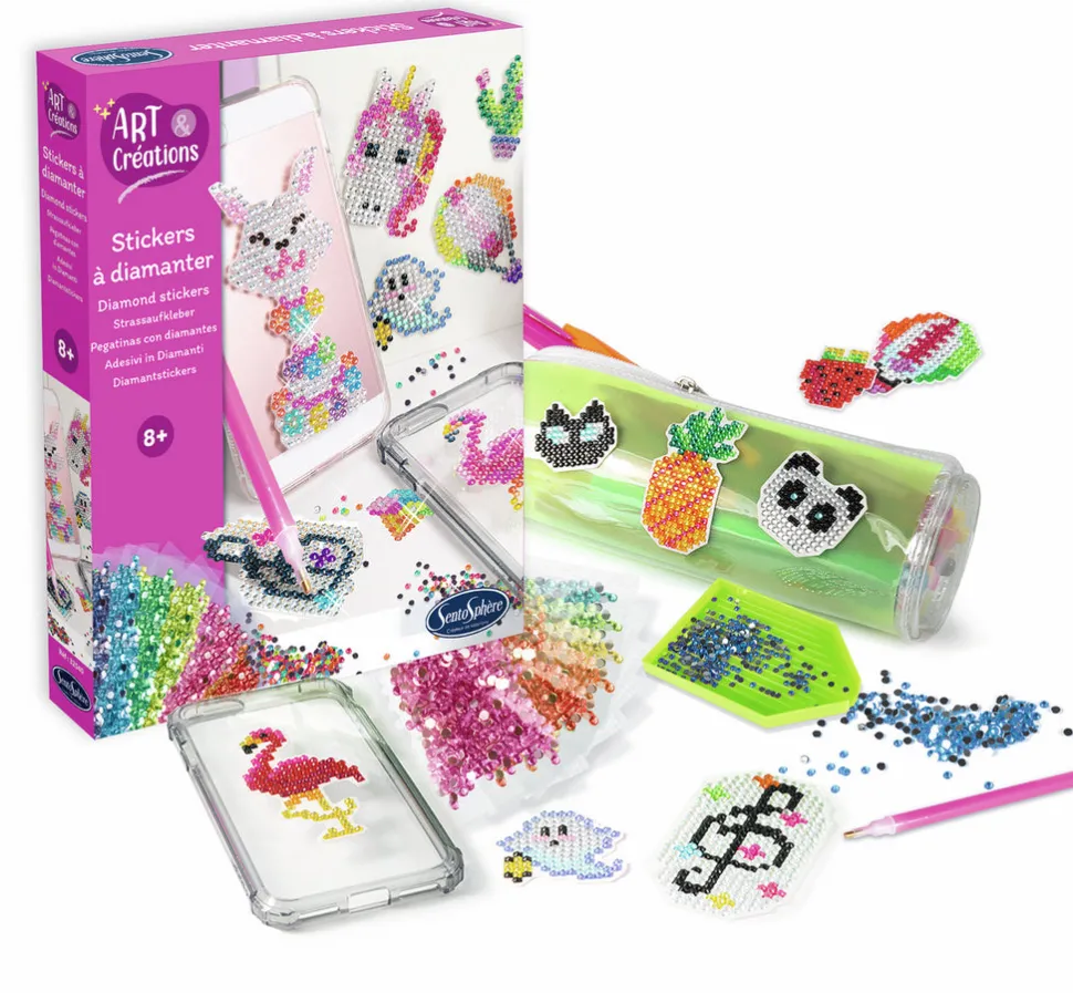 Con este kit creativo Diamond Stickers, crea magníficas pegatinas con forma de piña, unicornio, fresa e incluso helado.