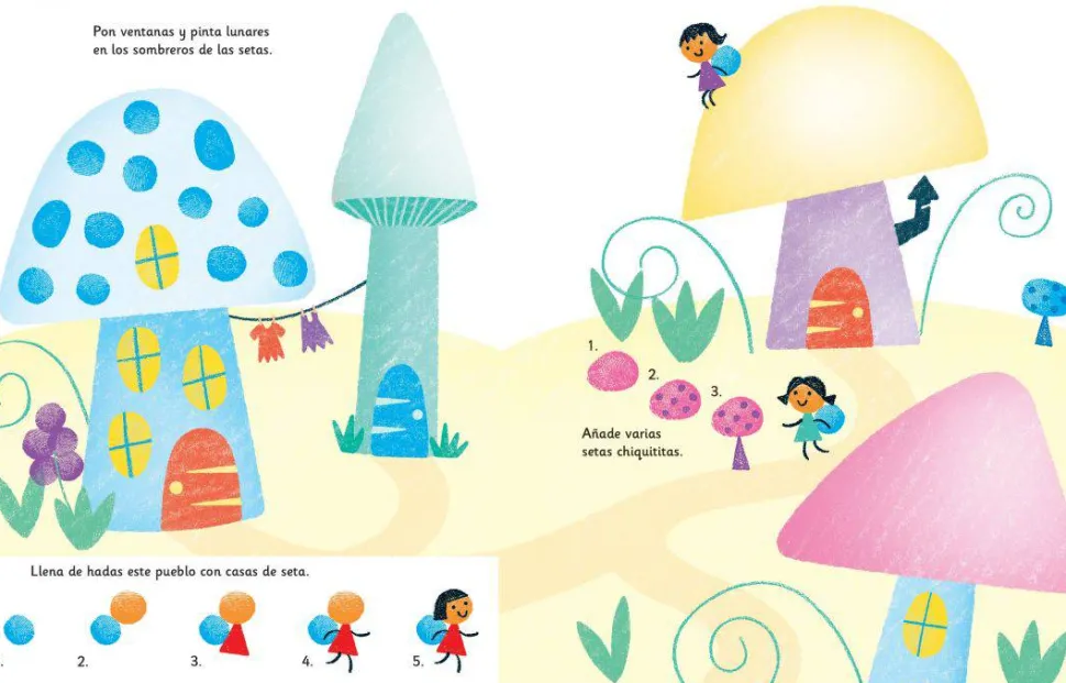 Con almohadillas de tinta de siete colores en la que mojar los dedos y muchísimas ideas explicadas paso a paso, los más pequeños podrán dar rienda suelta a su creatividad decorando preciosas escenas.