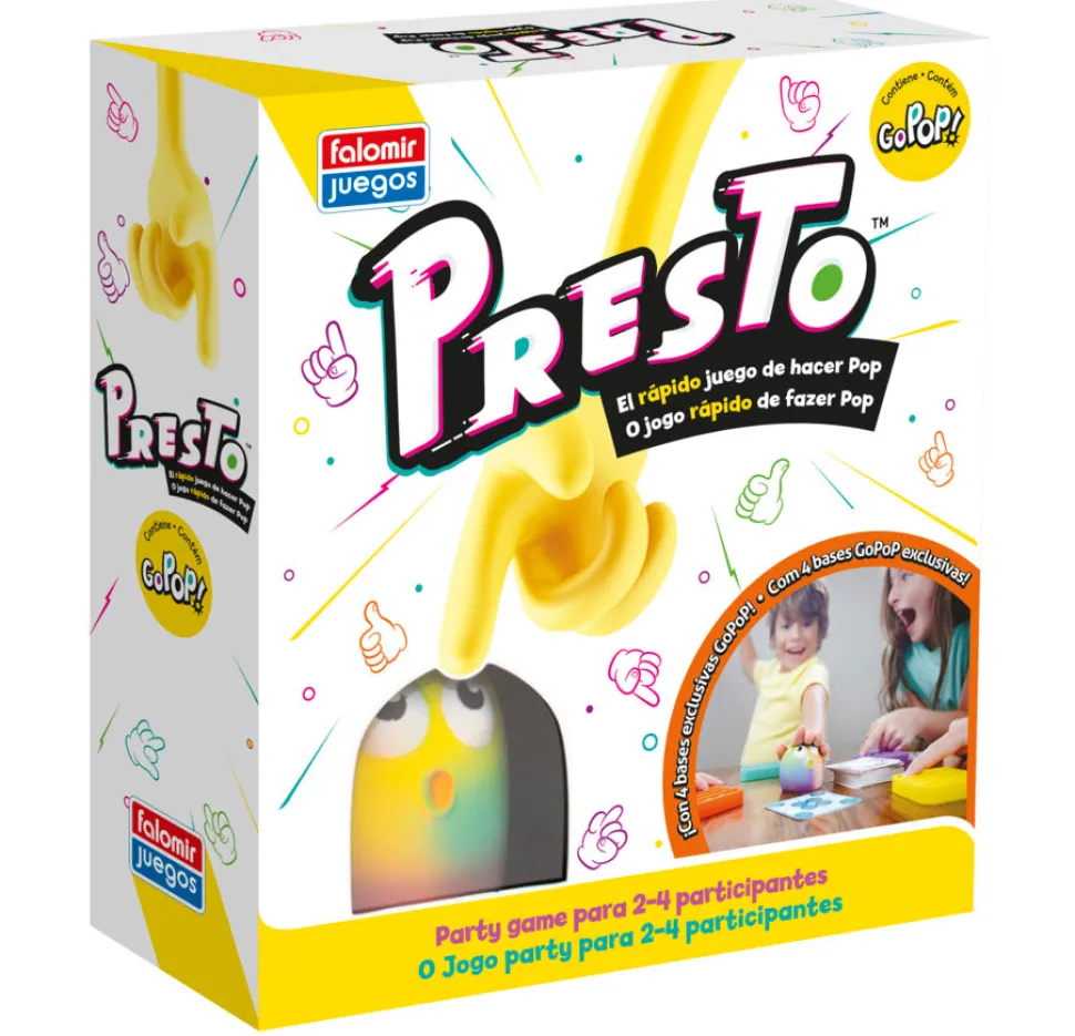 Presto es un divertido juego de retos para toda la familia que utiliza las famosas bases GoPoP como «tablero de juego».