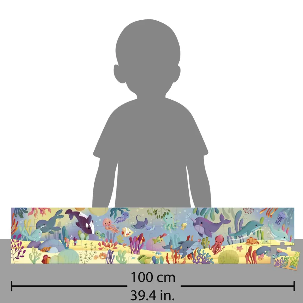 ¡Descubre las profundidades del océano! Sumérgete en busca de los animales marinos con este friso ilustrado de 36 piezas sobre el tema de las criaturas marinas, adecuado para niños a partir de 4 años. Este puzzle panorámico de 100 x 20 cm ofrece una inmersión total en las profundidades del mar. Las piezas se adaptan perfectamente a las pequeñas manos de los niños de 4 años, ayudándoles a desarrollar su motricidad fina y su lógica.