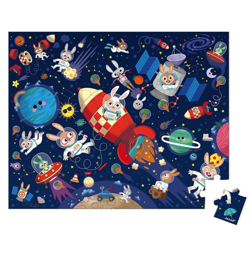 Conejito 1 a Conejito 2, ¿todo listo para la misión Zanahoria? Participa en una misión importantísima con este puzzle ilustrado que combina zanahorias, espacio y conejos astronautas, apto para niños a partir de 5 años. Con este puzle de cartón de 54 piezas, vivirás toda una experiencia de conquista espacial conejil. Viene con un póster que se puede utilizar como modelo. Las piezas se adaptan perfectamente a las manitas de los pequeños y les ayudan a desarrollar la motricidad fina.
