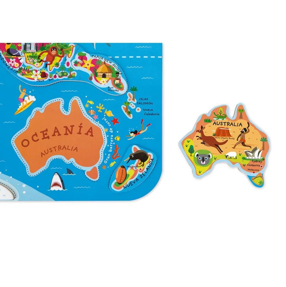 Diviértete poniendo cada país en su correspondiente sitio y conseguirás completar un maravilloso atlas mundial que podrás colgar de tu pared. Una manera lúdica y pedagógica de explorar el planeta.
