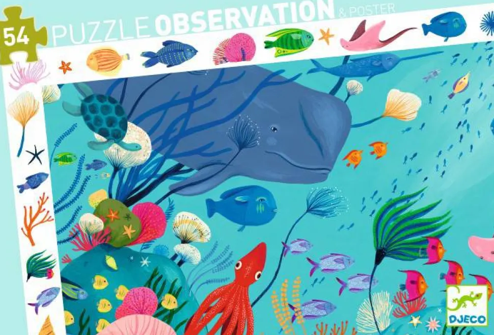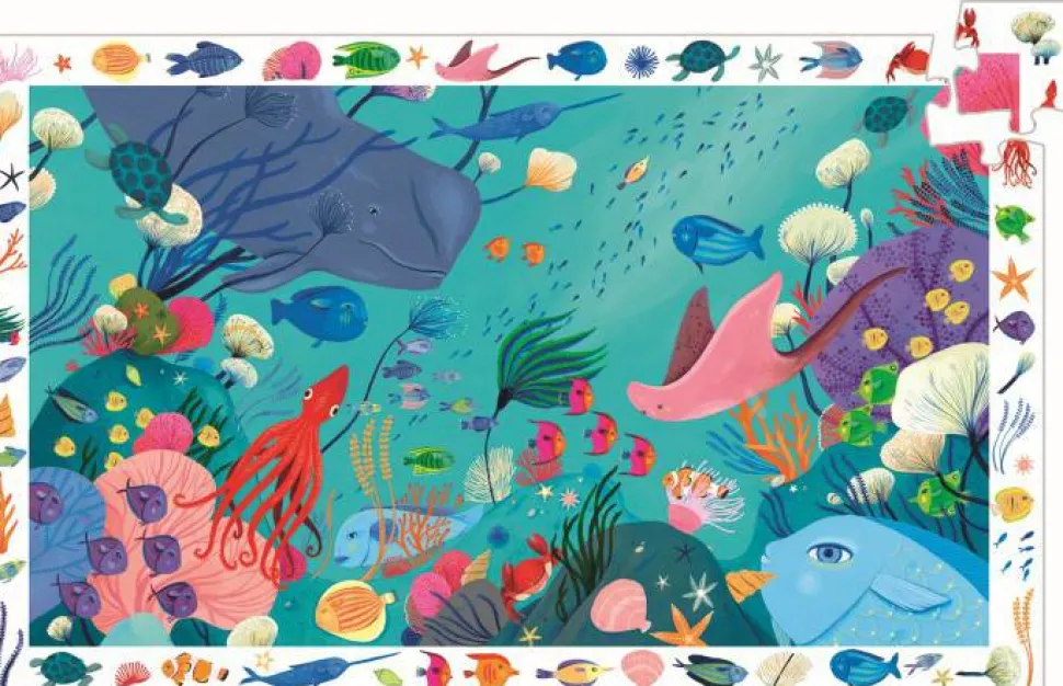 Puzle de observación de 54 piezas para descubrir la vida acuática. ¿Dónde se esconde el pez payaso? ¿De qué color es la tortuga? El niño crea su puzle y luego se divierte encontrando los elementos de la cenefa en la imagen