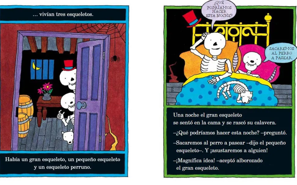 Tres simpáticos esqueletos salen una noche a pasear y a asustar gente. Juegos y canciones en una lectura terroríficamente divertida.