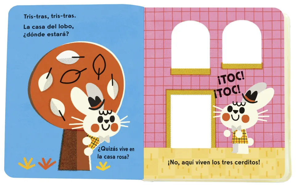 populares. Para encontrarlo, el conejito llama a la puerta de Ricitos de Oro, de los tres cerditos y de Caperucita Roja. Un libro de baño ilustrado por Pintachán, con elementos escondidos que quedan al descubierto cuando se mojan.