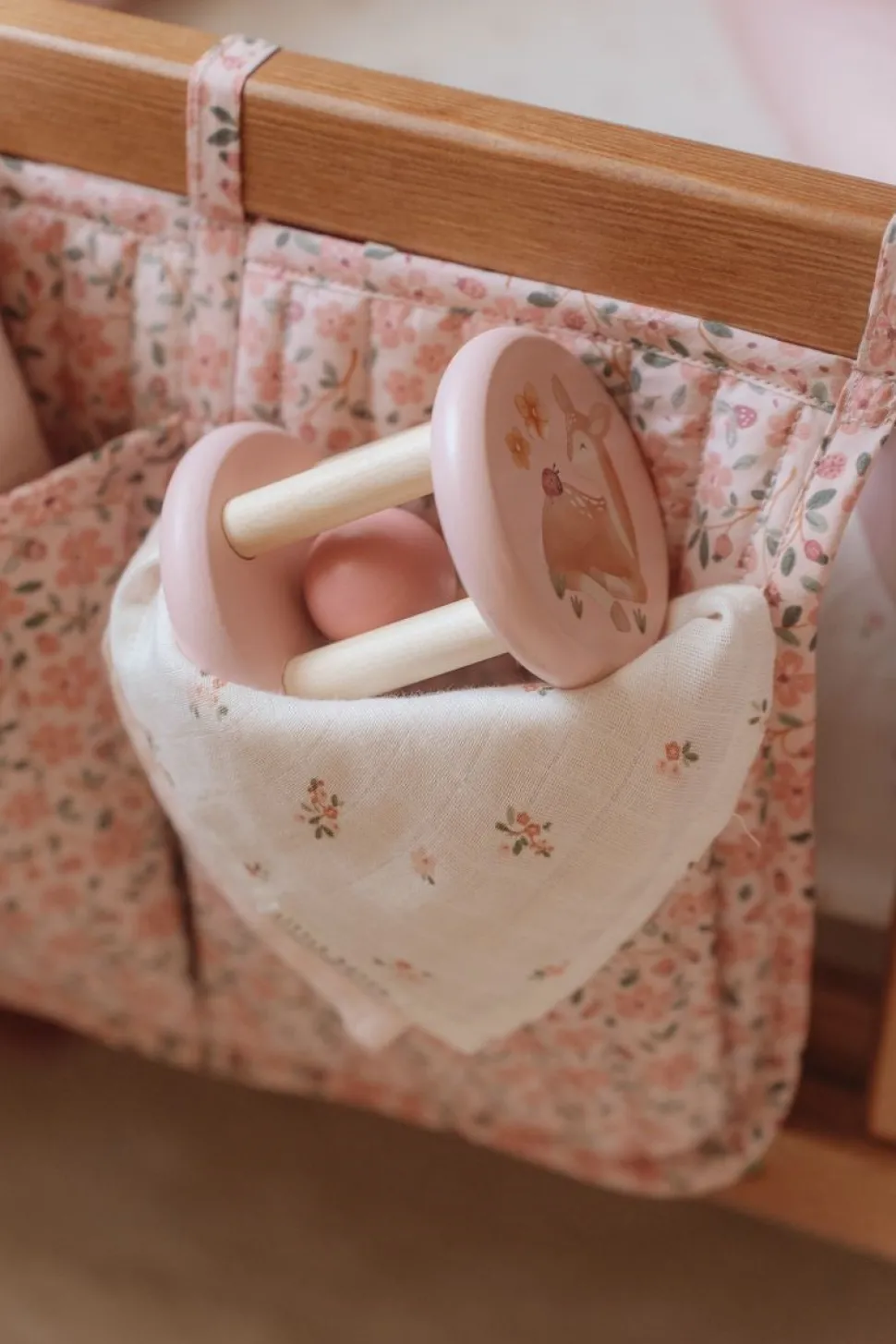 Este lindo sonajero de madera rueda y rueda, haciendo un sonido de timbre a medida que avanza.