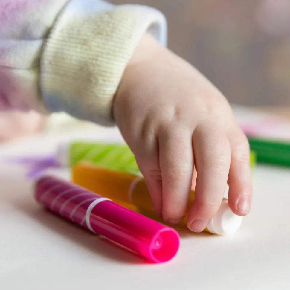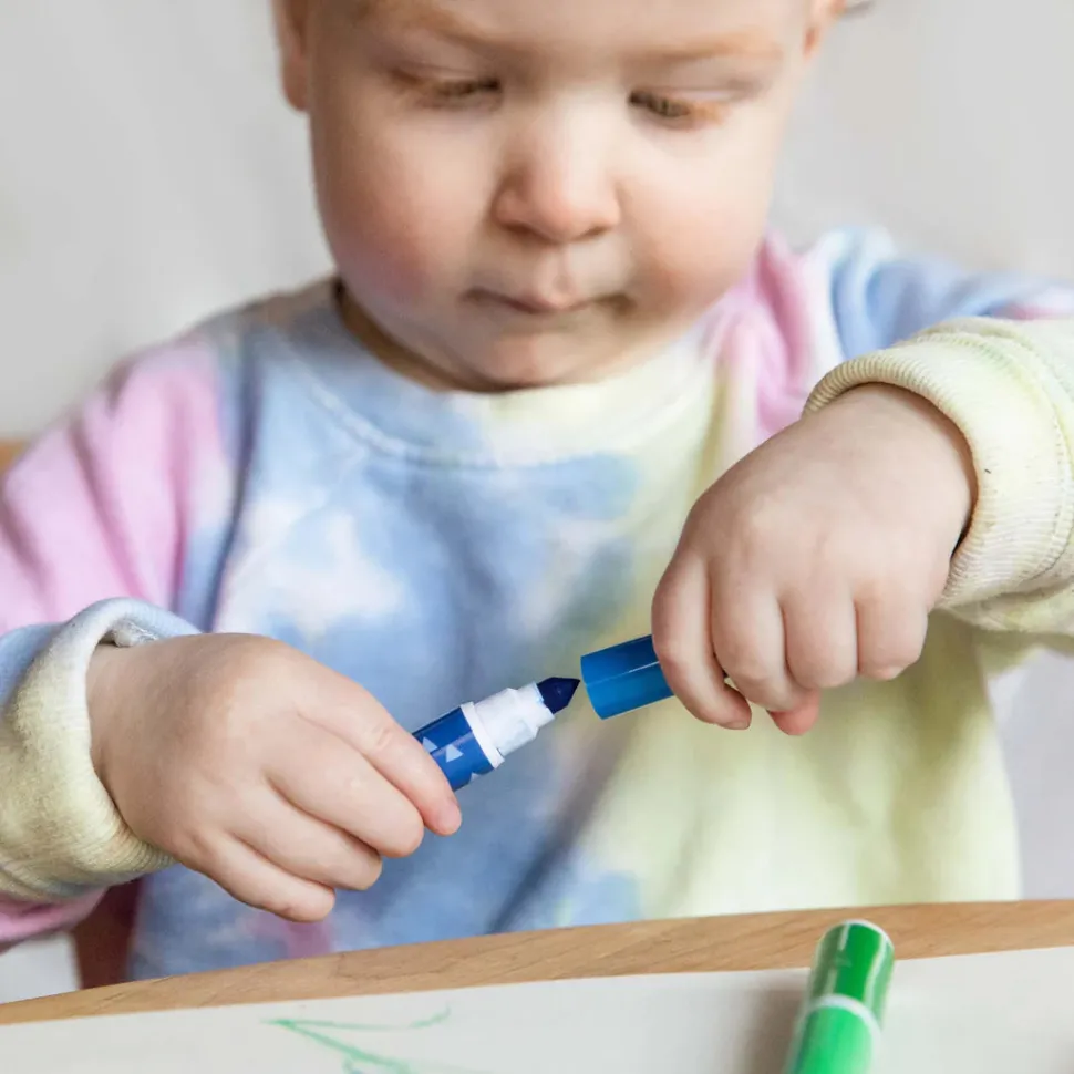Los marcadores Junior no tóxicos y ultralavables ayudan a los niños pequeños a explorar su creatividad mientras trabajan en su agarre de pinza y sus habilidades motoras finas.