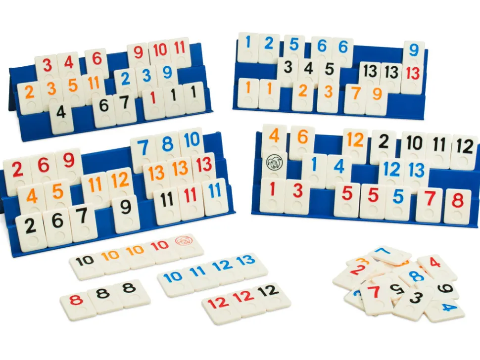 Simple y apasionante juego en el que cada jugador deberá combinar sus fichas, haciendo grupos de un mismo número en diferentes colores o escaleras de un mismo color para conseguir quedarse sin fichas. Versión hasta 4 jugadores.