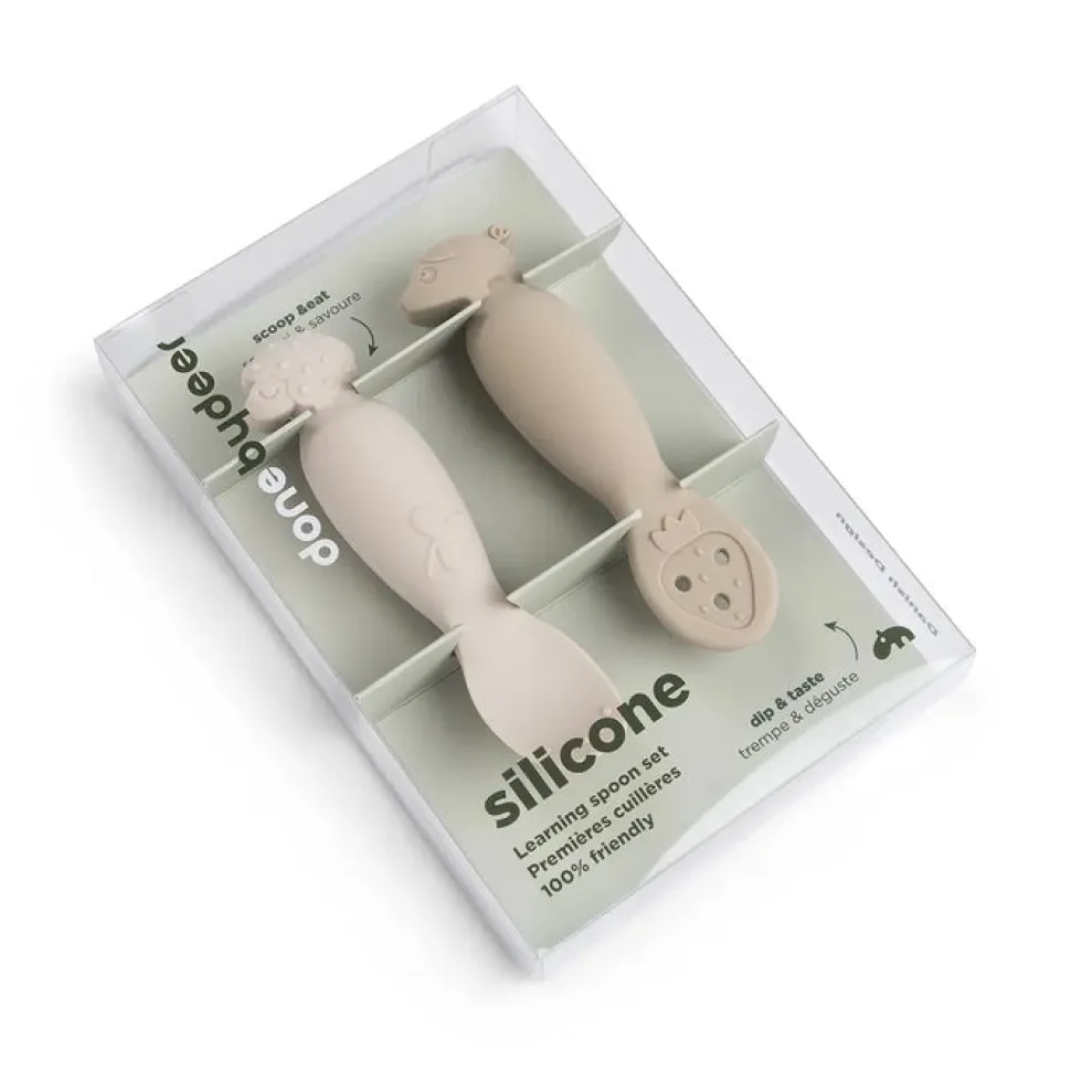Set de dos cucharas de aprendizaje de silicona para cuando tu pequeño quiera empezar a comer solito.
