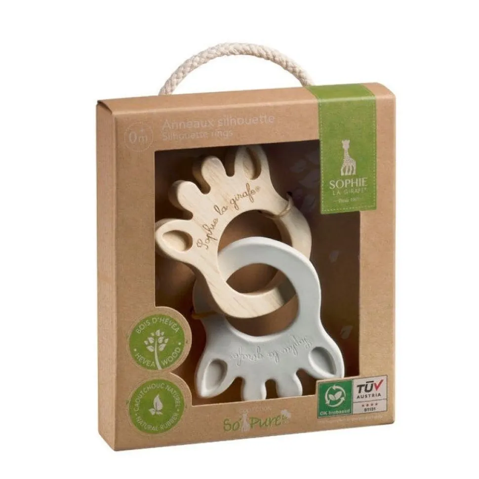 Esta Silueta Anillo está formada por dos anillos mordedores de caucho 100% natural y madera de Hevea entrelazados con la silueta de Sophie la girafe. Perfectos para que el bebé los agarre con facilidad siempre que necesite morderlos debido a los dolores provocados por la dentición. Una combinación ideal entre sostenibilidad y funcionaliadad que encanta a niños y mayores.