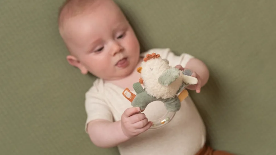 ¡Agarra, gira y agita! Haz sonar este sonajero con anillo, la forma de la gallina estimulará la curiosidad del bebé. Mueve las alas o frota el blandito vientre de la gallina.