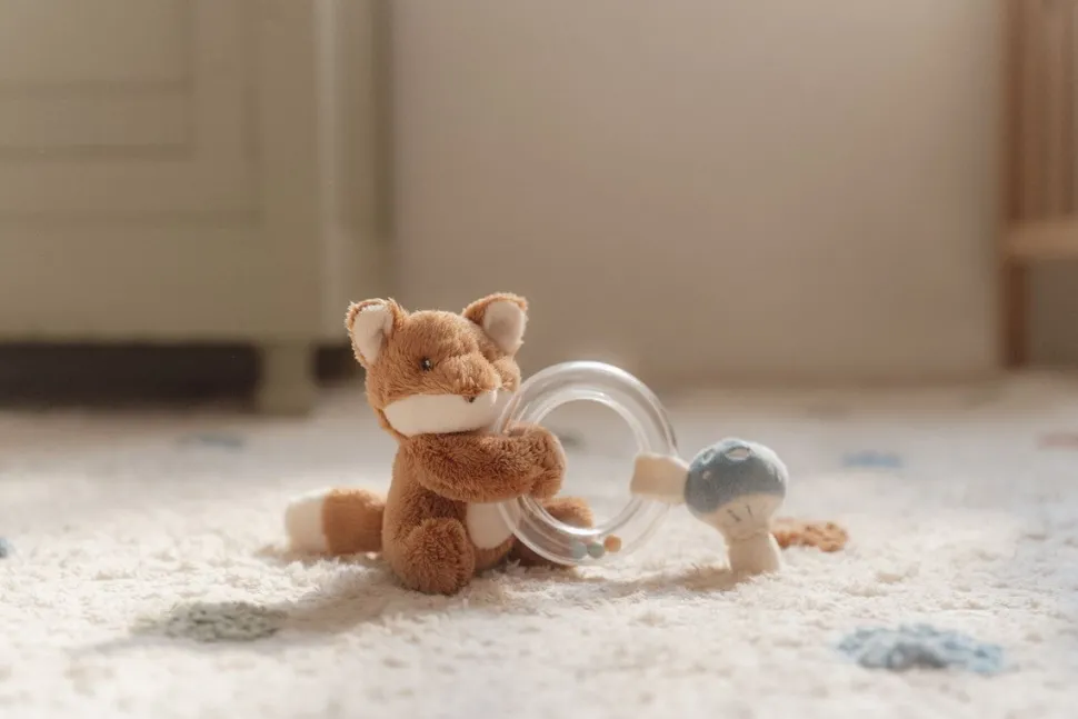 ¡Agarra, gira y sacude! El adorable zorro con su suave pelaje y su pequeña cola te invita a jugar y a poner en movimiento este sonajero. También ha elegido un pequeño hongo para que lo acaricies. El anillo transparente contiene 3 pequeñas cuentas de colores que empiezan a sonar cuando tu bebé juega con este divertido juguete. El sonajero no solo despierta la curiosidad y los sentidos de tu bebé, sino que también mejora la coordinación mano-ojo.