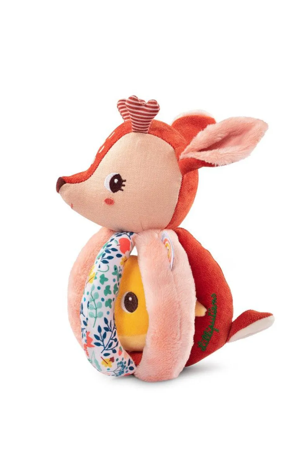 Un original sonajero, para que las manitas puedan agarrarlo fácilmente. Entre las asas se esconde un amiguito.