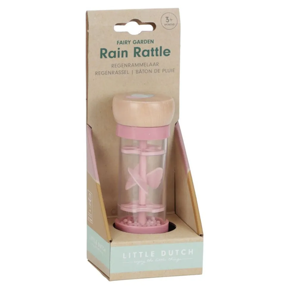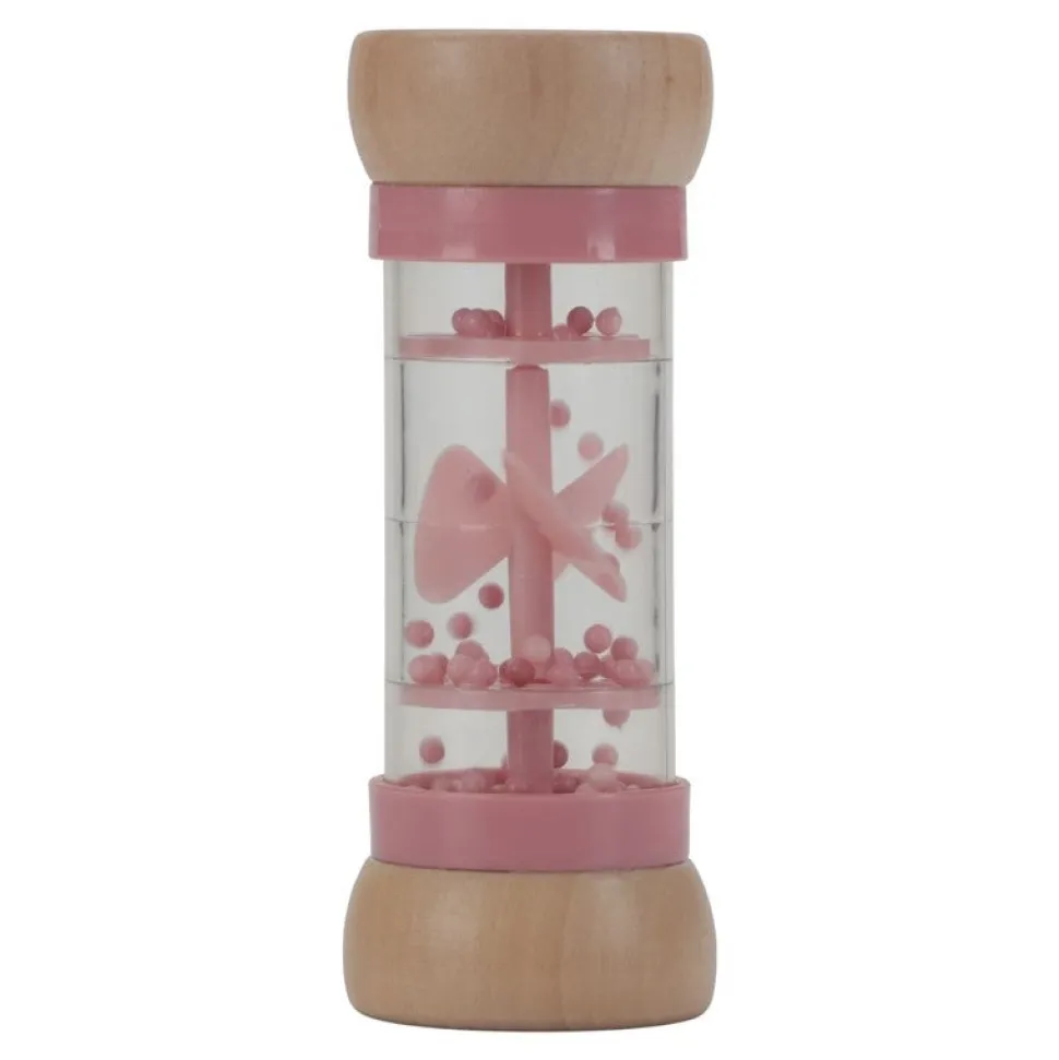 Dale la vuelta al sonajero de lluvia y las gotas se moverán hacia el otro lado haciendo suaves sonidos de gotas de lluvia.