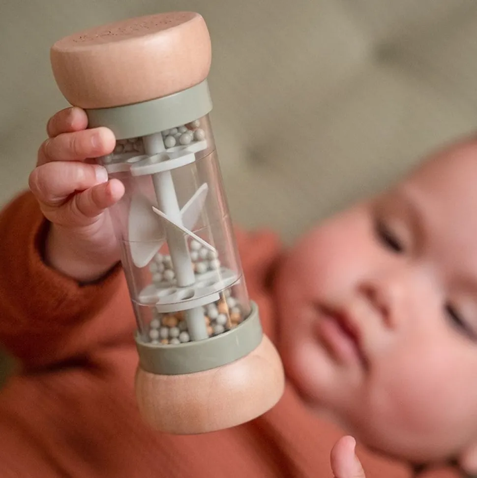 Dale la vuelta al sonajero de lluvia y las gotas se moverán hacia el otro lado haciendo suaves sonidos de gotas de lluvia.