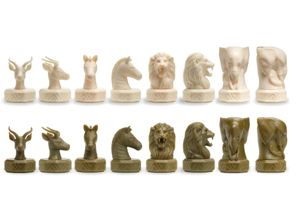 1 tablero a doble cara, 16 fichas de animales (8 blancas y 8 verdes. Cada set incluye: 2 leones, 2 gacelas, 2 cebras, 2 elefantes), 1 instrucciones del juego.