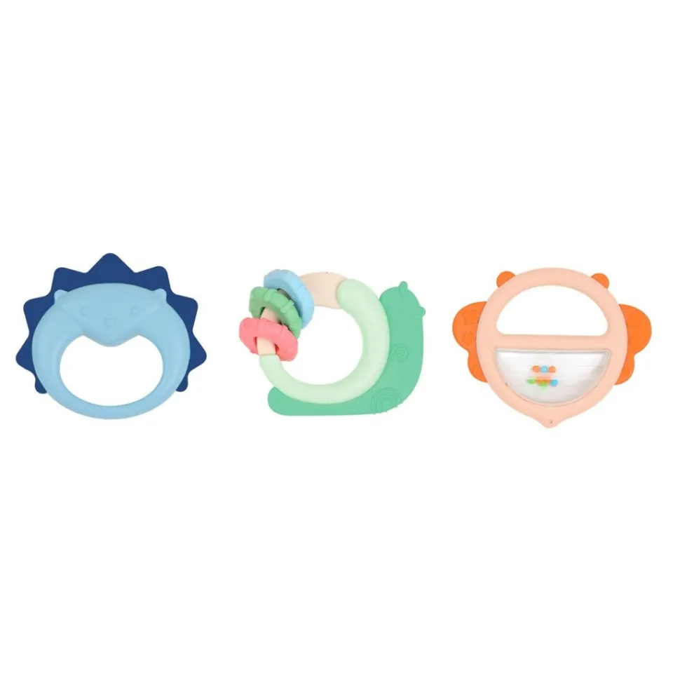 Este pequeño set de tres sonajeros es uno de los juguetes imprescindibles para regalar a los bebés para su desarrollo motor. Agarrar un objeto primero da como resultado un reflejo de agarre. Diseñados para manos pequeñas, estos sonajeros son ligeros y permiten un agarre muy fácil.