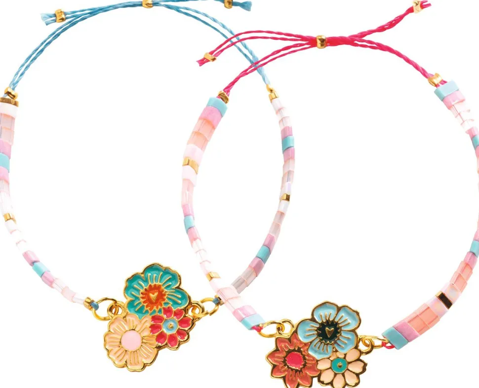 En una bonita caja brillante, una variedad de cuentas y amuletos de flores para crear 2 pulseras con los colores de la primavera. 2 joyas para guardar o regalar en una bonita bolsa de organza. Y para aún más recuerdos, se incluyen dos tarjetas con imágenes para escribir un bonito mensaje.