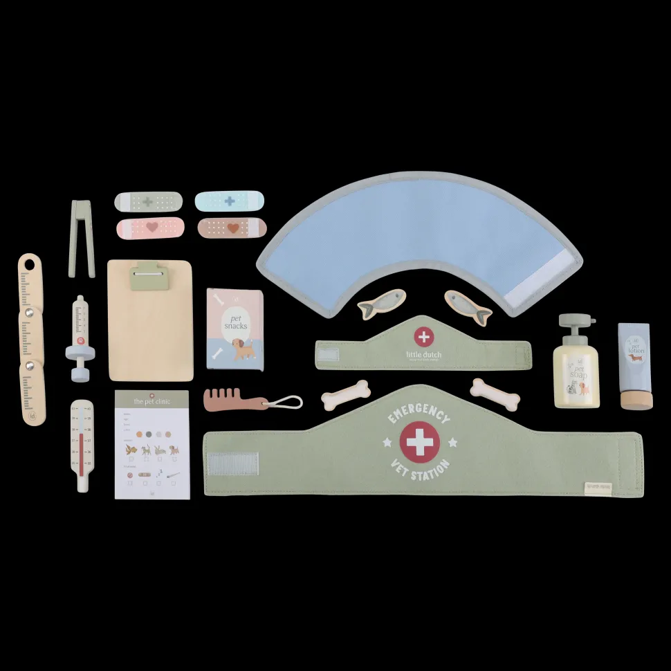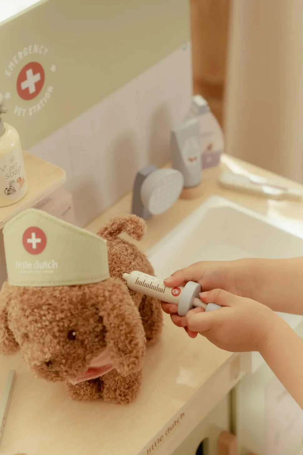 ¿Cuidas bien de peluches y mascotas de juguete enfermas? Con esta amplia clínica veterinaria de madera, tu pequeño podrá sumergirse por completo en el rol de un veterinario de verdad. El set contiene todo lo necesario para cuidar mascotas, como una ducha retráctil con lavabo, un peine, un termómetro, una jeringa y vendas. También incluye una diadema de tela y un clip especial para mostrar ilustraciones médicas y radiografías. ¡Hora del siguiente paciente!