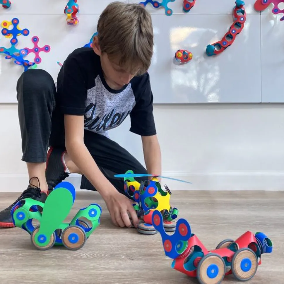 Este pack tiene 72 piezas en 10 formas únicas de CLIXO, incluidas ruedas y soportes. Las ruedas permiten llevar la experiencia de construcción al movimiento y la velocidad. Ya sea que haga clic en las ruedas de un automóvil o de un tren, de un pavo real rodante o de un elefante veloz, este pack lleva a los niños a descubrimientos creativos en movimiento.