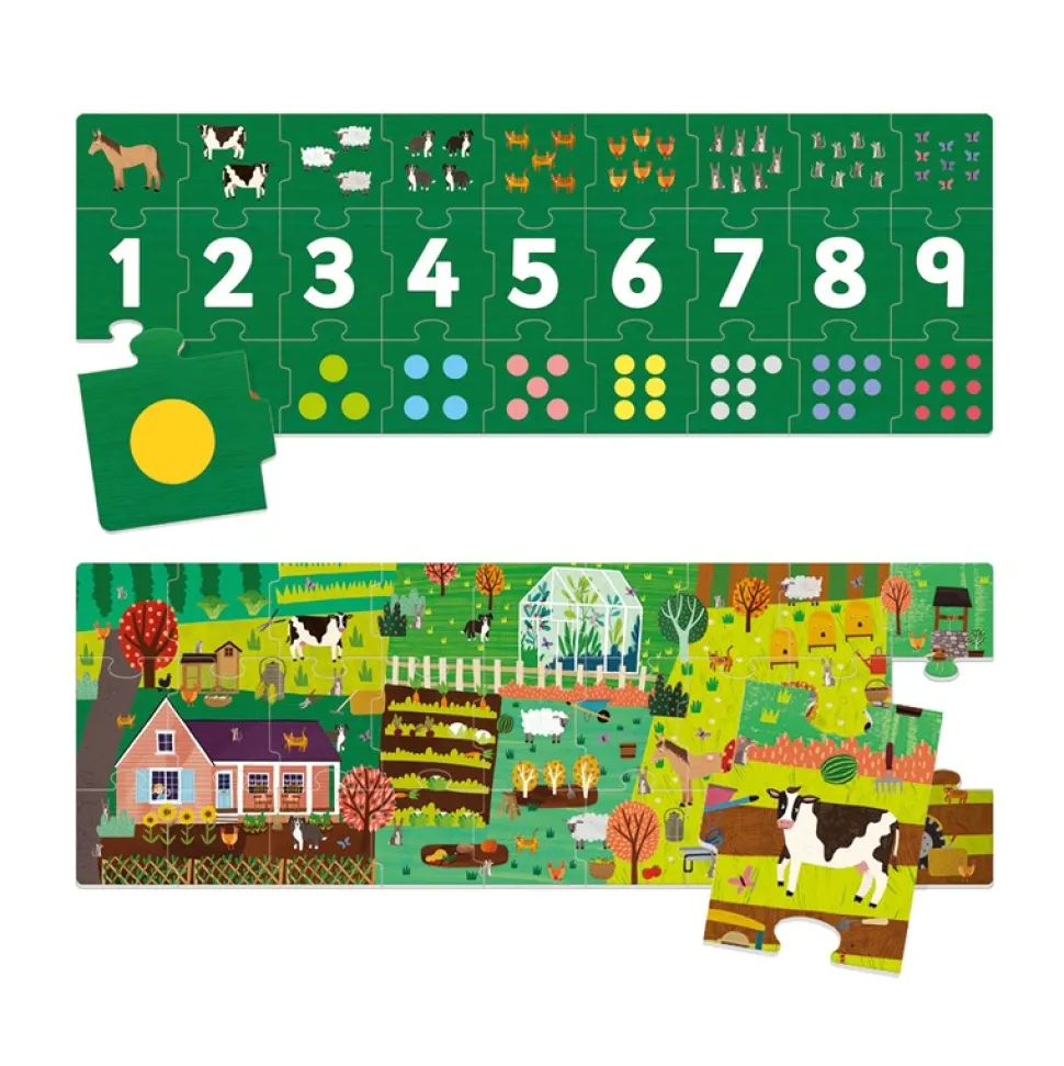 Un gran juego de números didáctico para jugar de varias maneras: en sentido vertical el niño asocia los símbolos del 1 al 9 a sus respectivas cantidades, en sentido horizontal ordena números y cantidades en secuencia.