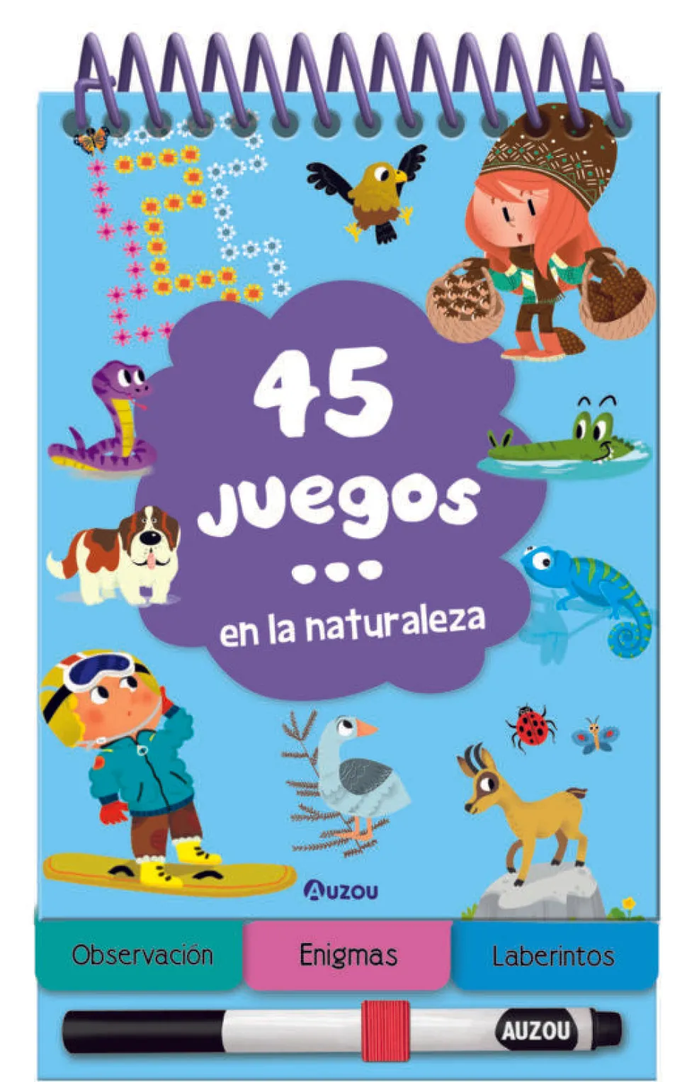 45 juegos es una colección de libro-juegos en un práctico formato pequeño con un rotulador borrable ¡para divertirse por todas partes y todo el tiempo! 45 juegos alrededor de un momento o situación, divididos en 3 secciones: 15 juegos de observación (busca y encuentra, juegos de sombras, juegos de las 7 diferencias, intruso, juego de parejas), 15 enigmas (sudoku, crucigramas, sopas de letras, juegos de deducción, unir puntos, juegos gráficos, juegos de cálculo) y 15 laberintos.