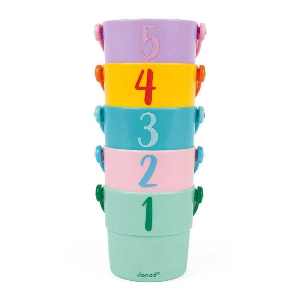 Llena tus cubos de agua o de espuma y levántalos lo más alto posible para ver cómo sale el agua por los distintos agujeros.
