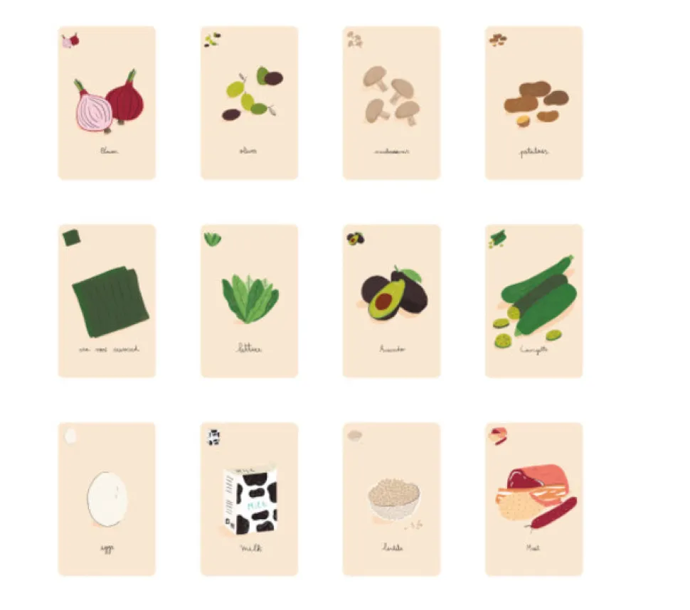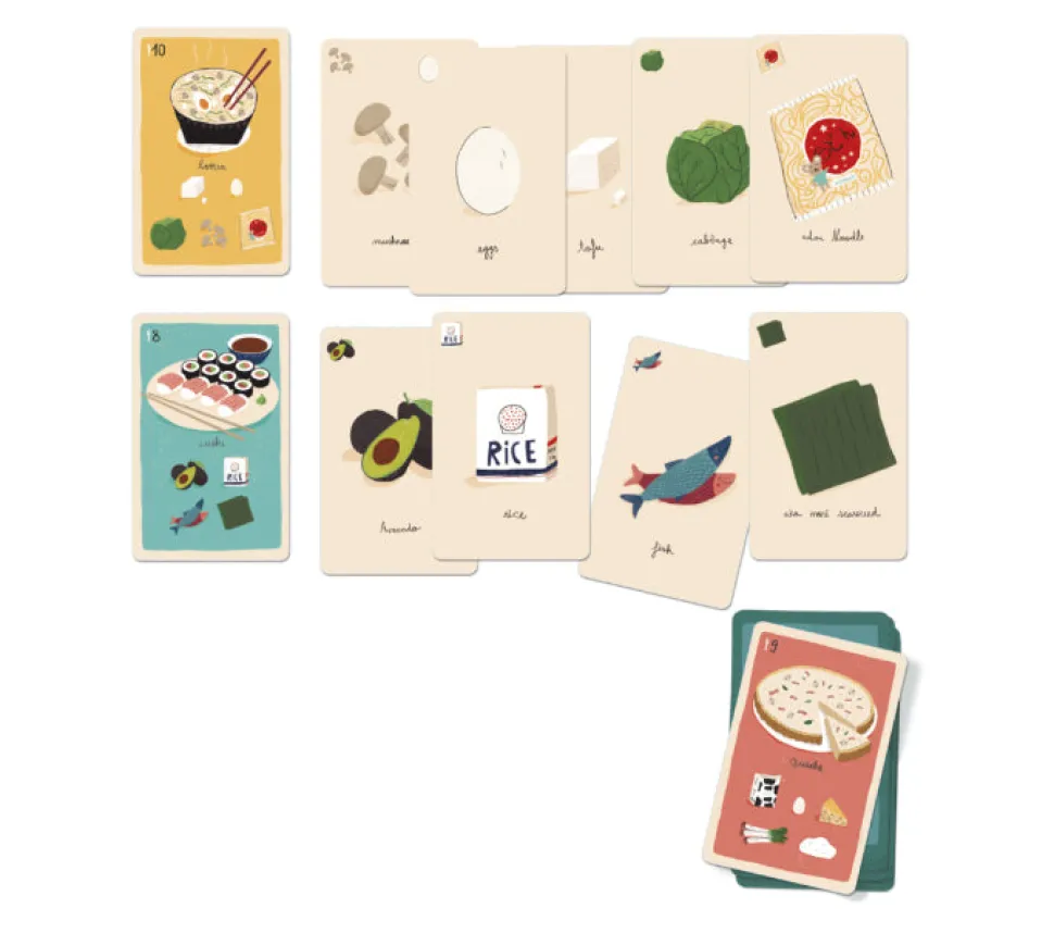 El juego incluye 17 cartas de recetas con platos de todo el mundo y 63 cartas de ingredientes.