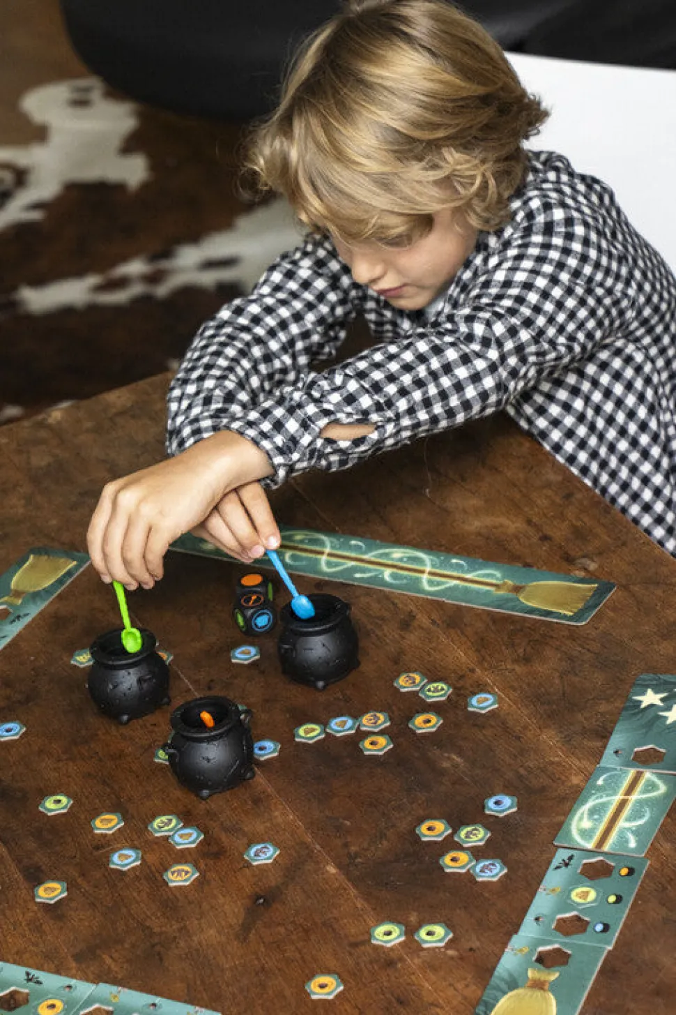 Abracada Broom es un juego de mesa de memoria adaptable y toma de decisiones con ingredientes mágicos, poderosas pociones y escobas voladoras.
