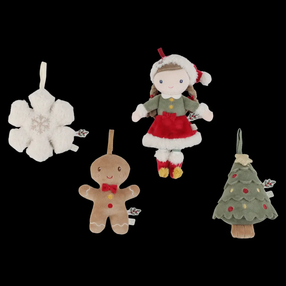 Convierte tu árbol de Navidad en un escenario mágico con el set de adornos navideños Rosa. En la caja encontrarás 4 adornos de peluche: la muñeca navideña Rosa, un alegre hombrecito de jengibre, un festivo árbol de Navidad y un suave copo de nieve, todos cuidadosamente diseñados para darle a tu árbol ese toque especial.