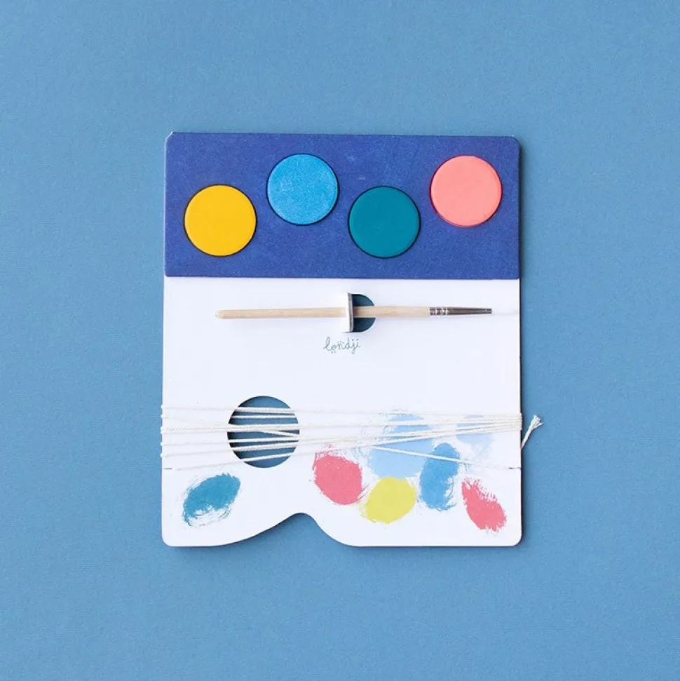 En la caja encontrarás un cordel de 2m, 1 pincel, 9 cartulinas de animales y 4 colores diferentes de acuarelas.