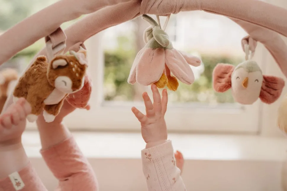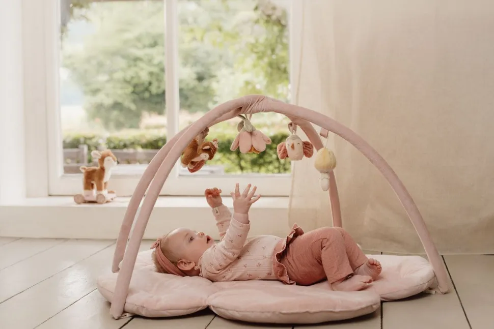 ¡Hay tanto para ver, tocar y oír! Cada día es una aventura con esta alfombra de juego con forma de flor. Presentada en un suave tono rosa, tiene dos arcos de pana con cinco peluches colgantes diferentes de la colección Fairy Garden. El pequeño ciervo, el pájaro, la flor, el hongo y la fresa ayudarán a desarrollar las habilidades sensoriales y la coordinación mano-ojo.