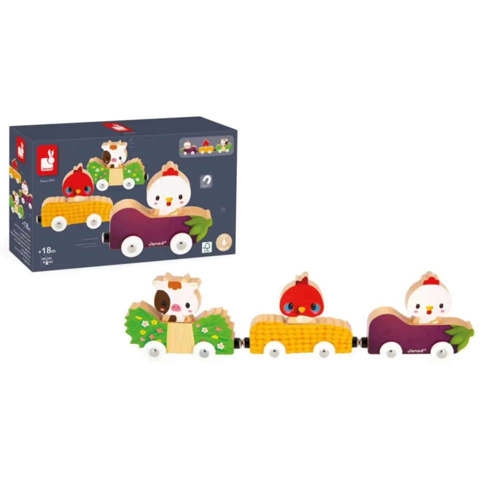 ¡Embárcate en una aventura con una vaca, un pavo y una gallina ! Cada animal tiene su propio coche con la imagen de su comida favorita, ¡qué divertido! Gracias a los imanes, los animales se adhieren a su coche y son intercambiables. Así tu hijo podrá intercambiar los animales en los vehículos y por qué no, colocar el conejo en el carro de queso y el perro en el carro de zanahoria. Para permanecer juntos durante todo el viaje, estos pequeños coches están equipados con imanes que se mueven uno detrás del otro. ¡Perfecto para desarrollar la imaginación! Juguete magnético de madera FSCTM.