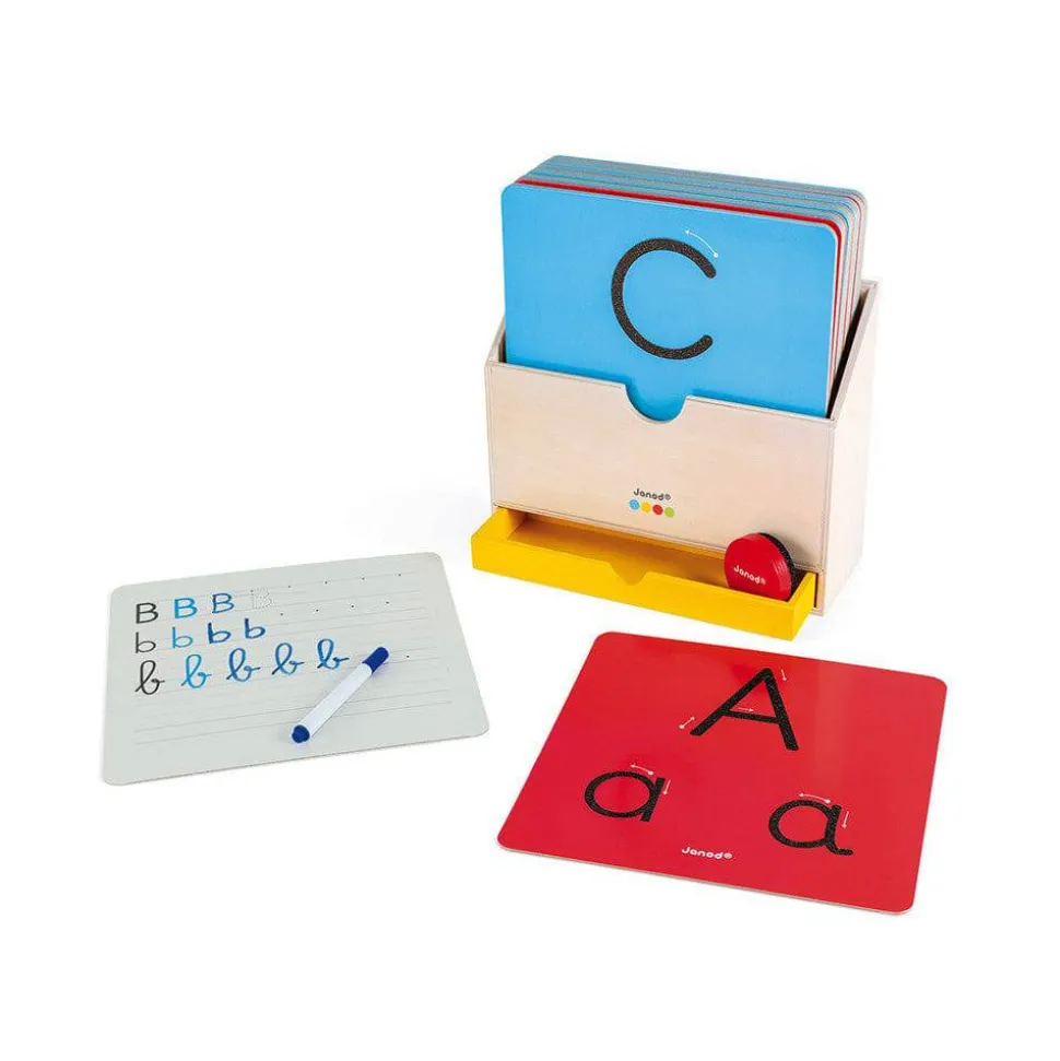 Las tarjetas se pueden guardar en la bonita y práctica cajita de madera. Incluye un pincel y un bolígrafo, que caben en el cajón. Este producto desarrolla: el aprendizaje de la escritura, el sentido del tacto.