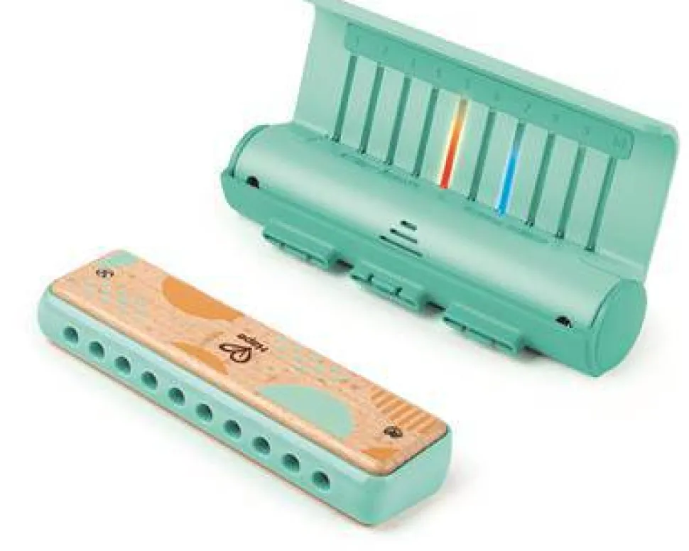 El panel Light Up Play es ajustable, lo que facilita la visualización mientras juegas. Está alimentado por una batería de litio incorporada que se puede recargar con el cable incluido. Tiene un lado curvo que cubre los agujeros de la armónica y los mantiene limpios cuando llevas la armónica en tu bolsillo o bolso. La armónica también se puede tocar sin el panel.