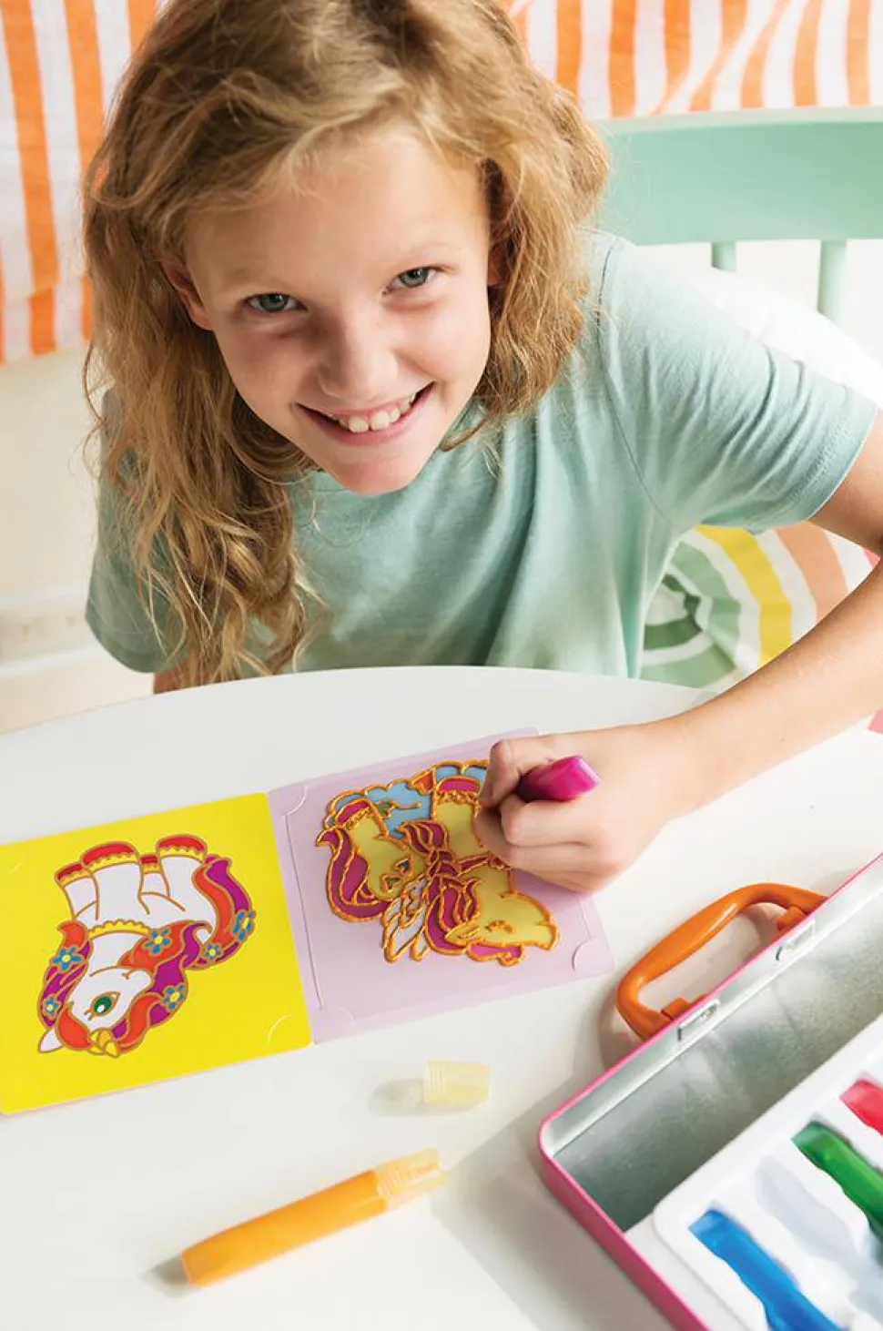 Este set incluye pinturas especiales que se pegan a las ventanas. Una vez los peques acaben de pintar su unicornio sobre el plástico, deberán retirarlo y colocarlo en cualquier ventana o espejo. ¡Convertirán sus cristales en un mundo vibrante de colores y dulces unicornios!