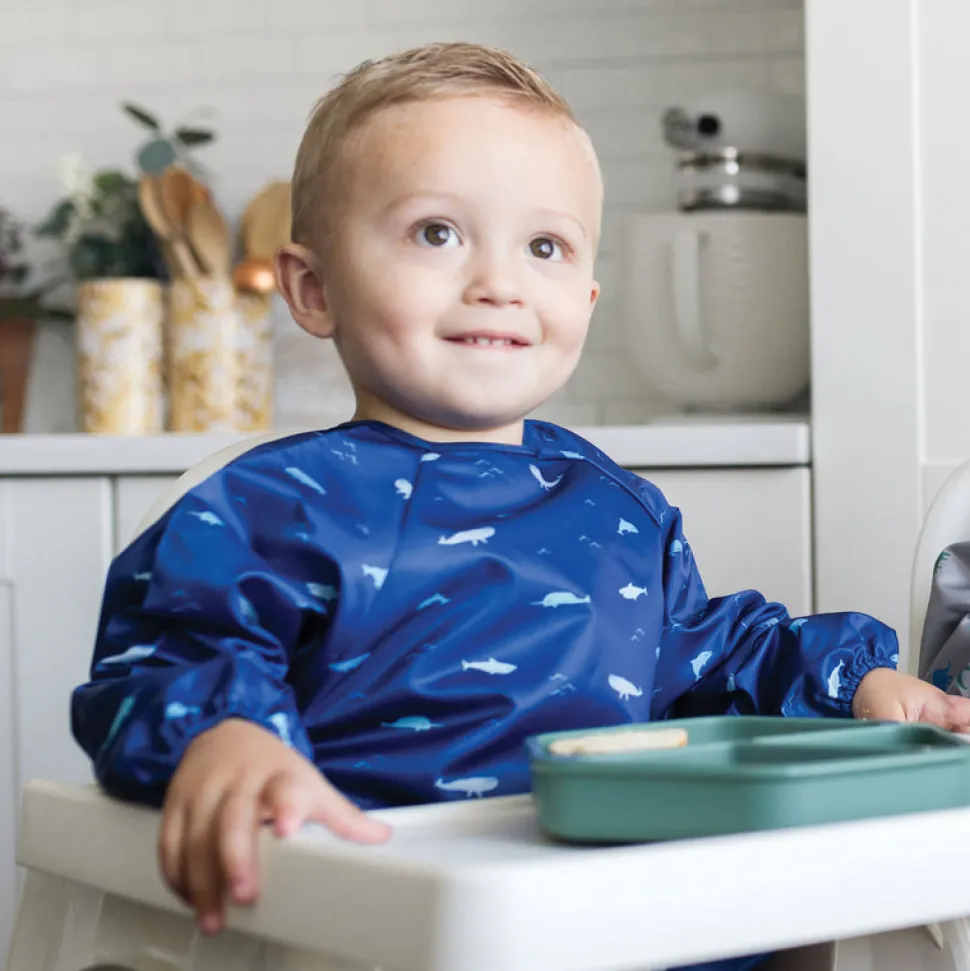 El bolsillo grande con tapa permanece abierto para recoger los derrames y los alimentos.