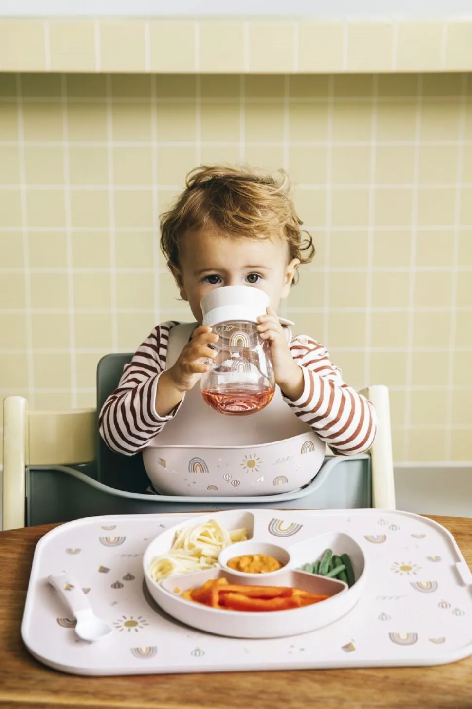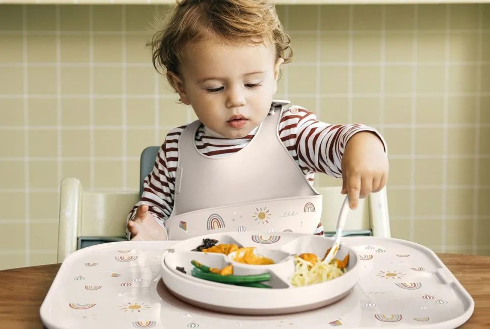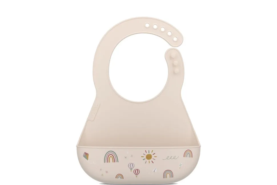 Babero de silicona de la colección MIO con cierre ajustable en el cuello y bolsillo profundo para atrapar la comida. Fácil de limpiar y transportar.