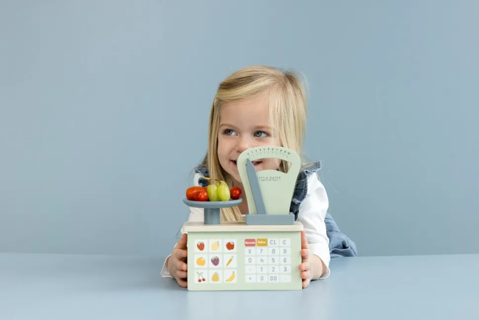 Imagina tener tu propia tienda de frutas y verduras, métete en el papel con esta adorable balanza. Comprueba el peso y calcula el precio total para informar al cliente. O utiliza la balanza para jugar en la cocina a pesar los ingredientes de tus recetas favoritas.