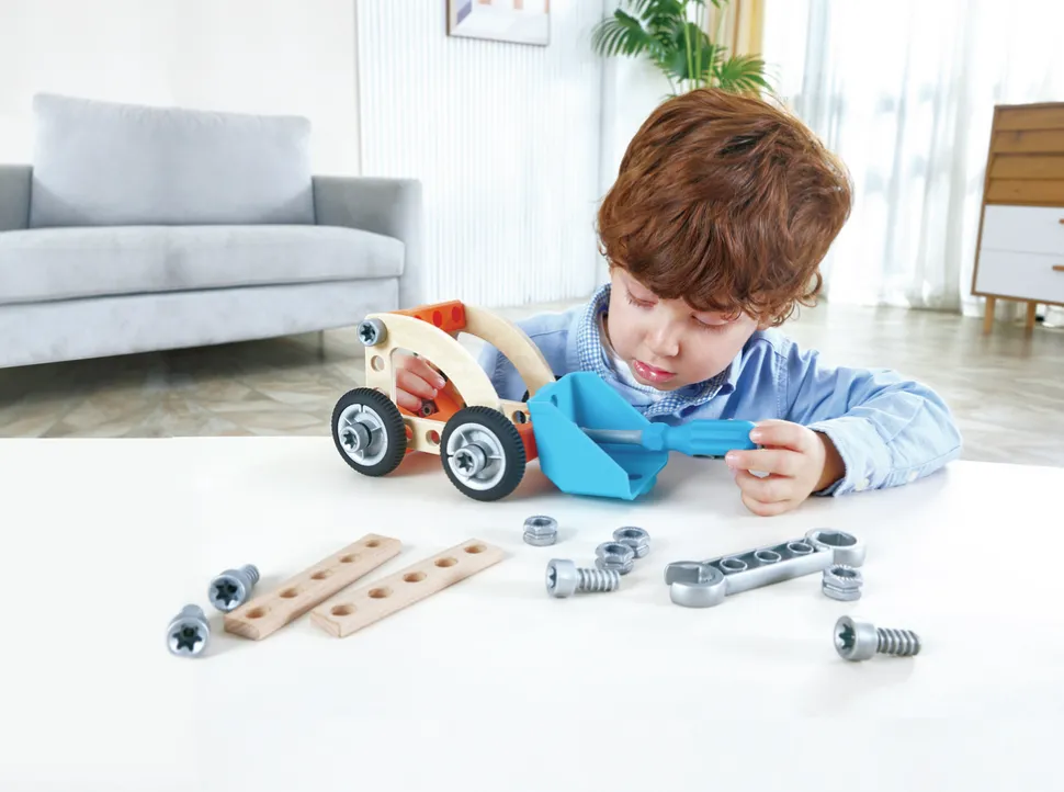 ¡Construye tu propio coche con ruedas que realmente giran! Elige cuál de los cinco coches te gustaría construir o crea tu propio vehículo de fantasía. Saca las piezas de madera, tornillos, tuercas, pernos y ruedas de la maleta de transporte, y luego utiliza el destornillador y la llave inglesa incluidos para construir tu vehículo. Las herramientas son seguras y fáciles de usar. ¡Incluso puedes combinar este set con otros sets de construcción para ampliar tus creaciones! Este fantástico set interactivo anima a los más pequeños a imitar el comportamiento de los adultos de una forma divertida y segura, y es perfecto para fomentar la coordinación mano-ojo y las habilidades motoras finas. El set también ayuda a promover la imaginación y la capacidad de resolución de problemas, además de favorecer el pensamiento lógico y el desarrollo cognitivo creativo.