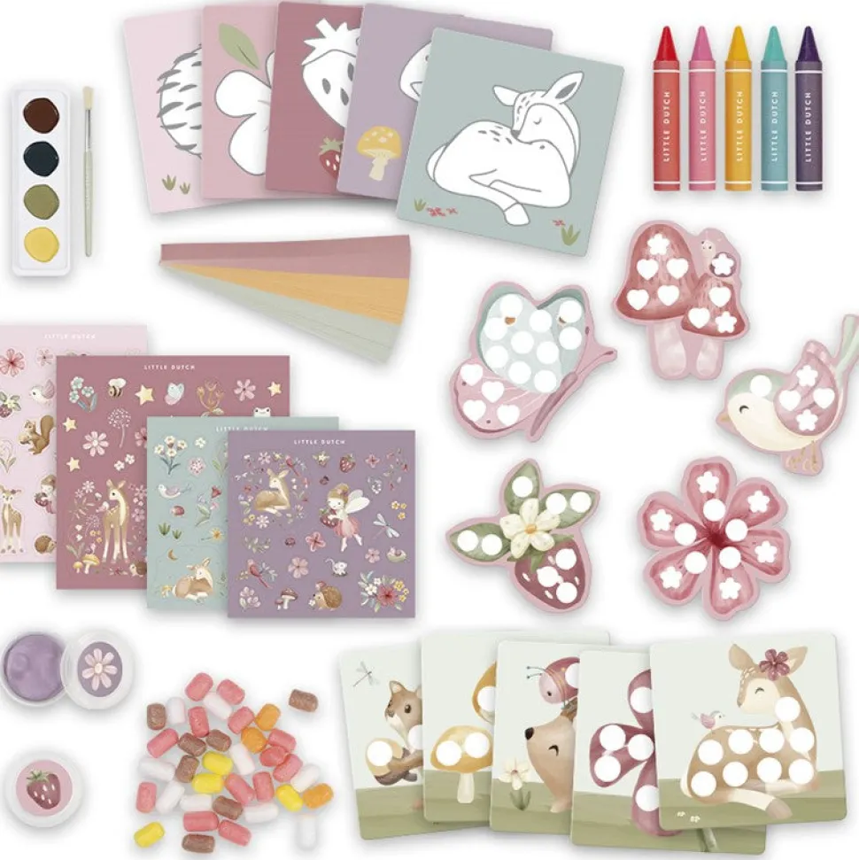 aja de creatividad Fairy Friends con todo lo que necesitas para empezar a ser creativo inmediatamente, por ejemplo: pegatinas, papel de dibujo, ceras, pintura, arcilla expandida, sellos, pegatinas, etc.