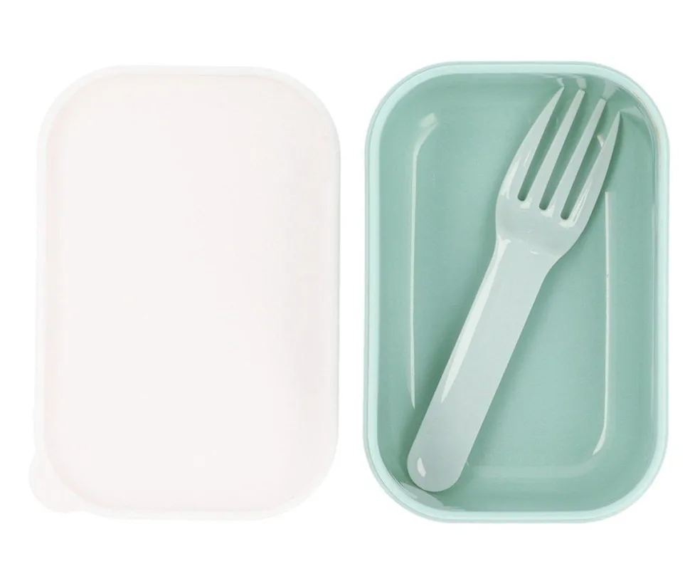 Esta pequeña cajita de fruta con tenedor, está pensaba para meter dentro de otra caja de almuerzo más grande y llevar la fruta o pequeños snacks separados del resto de almuerzo.