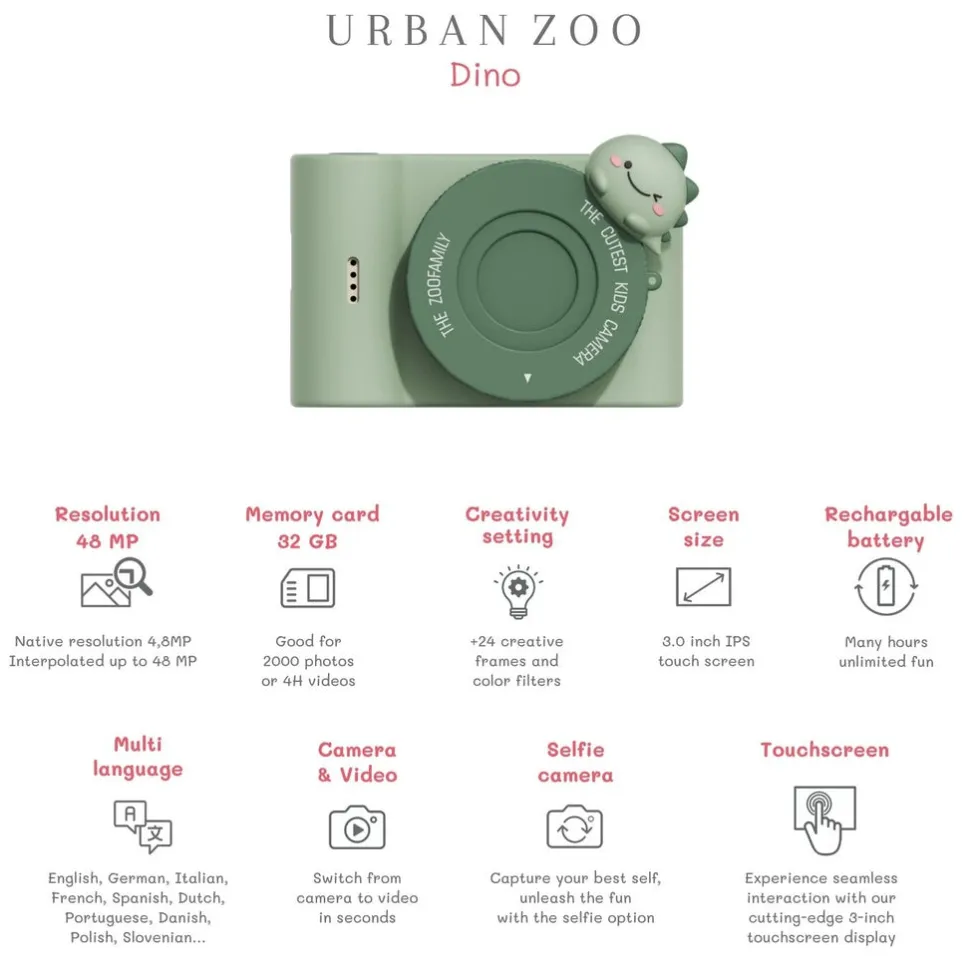 Su primera cámara. Esta cámara digital hace fotos y graba vídeo. La cámara digital infantil de The Zoofamily es extremadamente bonita, pequeña y liviana. Además, podrán imprimir sus fotos al instante, siempre que quieran.