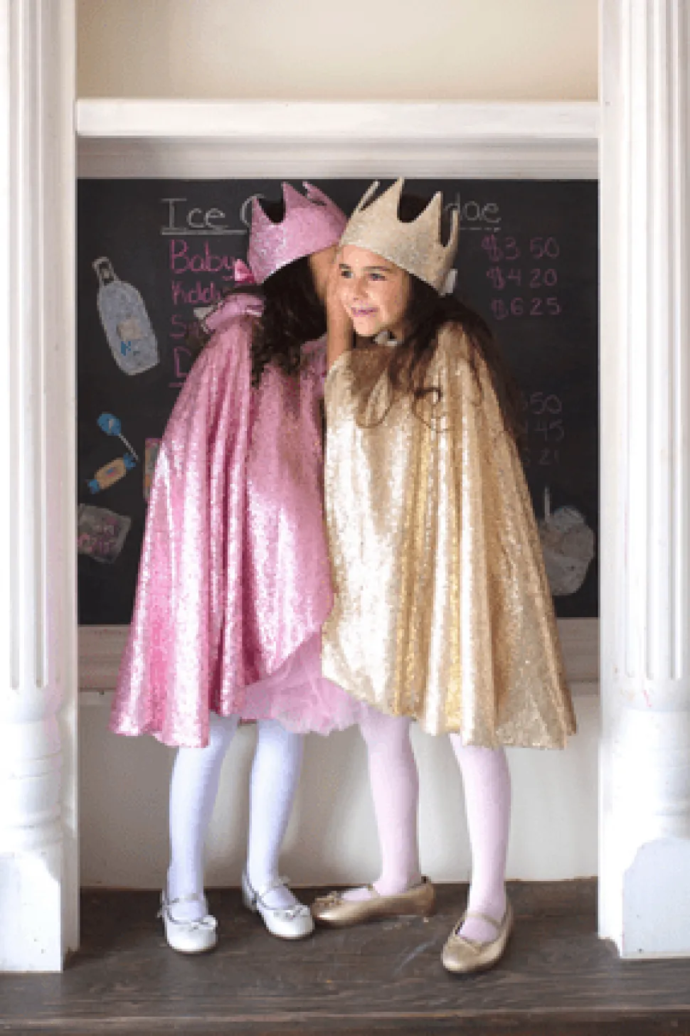 Nuestra capa está hecha con cientos de lentejuelas doradas y forrada con malla suave. La capa tiene un hermoso lazo dorado en el cierre del cuello con velcro. ¡Esta capa brillará cuando te muevas y es perfecta para los pequeños a los que les encanta jugar a disfrazarse!