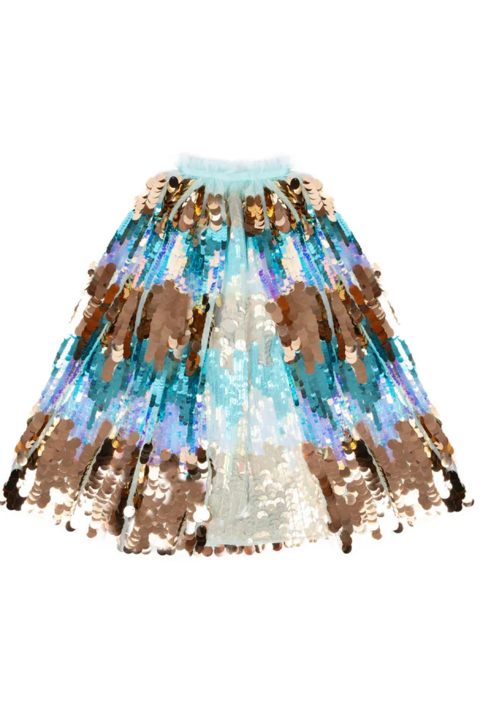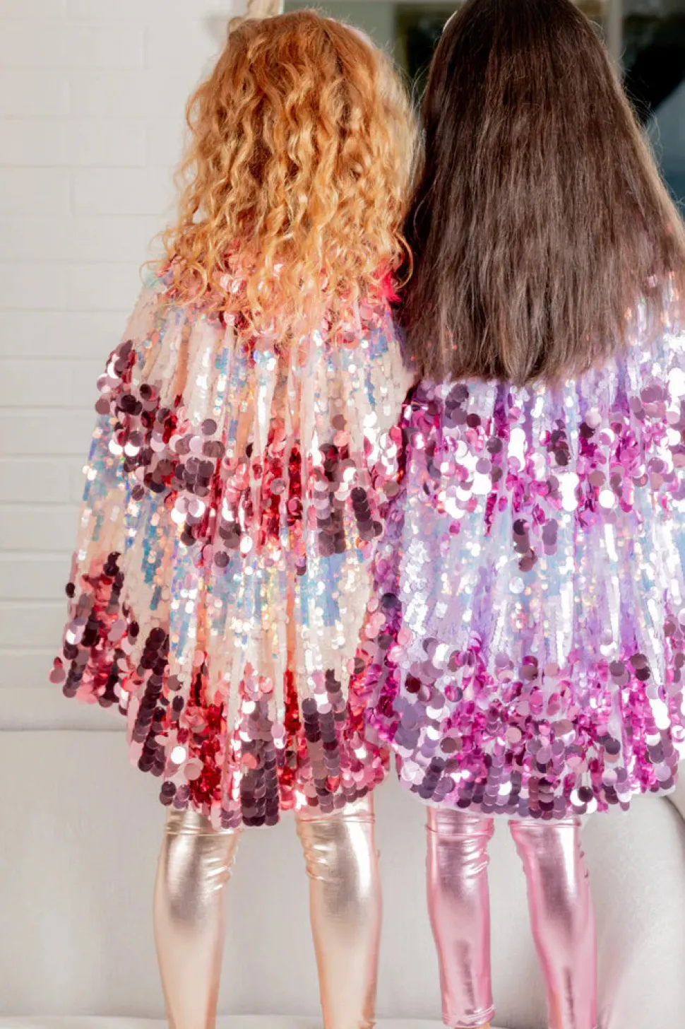 Eleva el estilo de tu pequeña con la capa de lentejuelas turquesas y doradas de 5th Avenue. Esta impresionante capa está confeccionada con una mezcla de lentejuelas grandes y pequeñas, con lentejuelas turquesas y doradas que se alternan en atrevidas rayas a lo largo de la capa. Las brillantes lentejuelas crean un efecto deslumbrante con cada movimiento, añadiendo un toque mágico a cualquier atuendo.