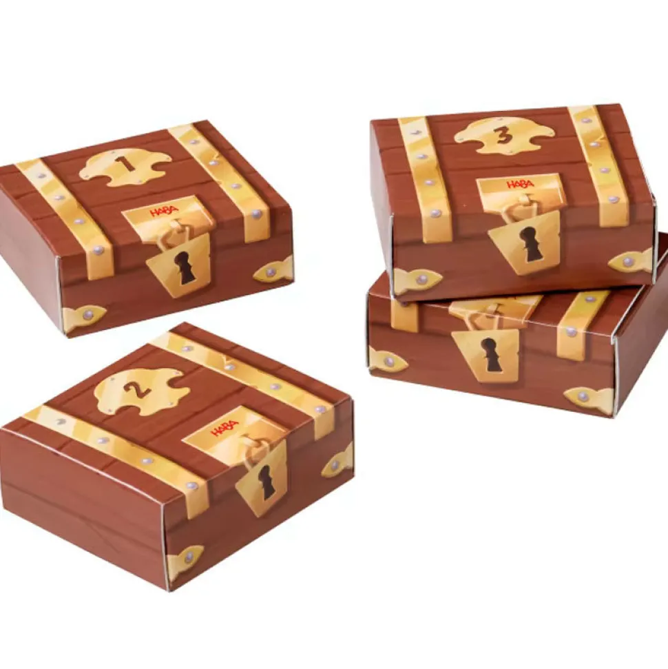 Contenido: 1 libro de aventuras, cuaderno de tesoros, barco formado por 2 piezas, mapa del tesoro, tablero de recompensas, 15 fichas de ala hacia arriba, 1 reloj de arena, 5 figuras de tripulación, 5 remos, 1 bola Capitán Pepe, 1 base para la bola, 1 sobre, 8 cofres con tesoros, cartas Legacy y 1 instrucciones del juego.